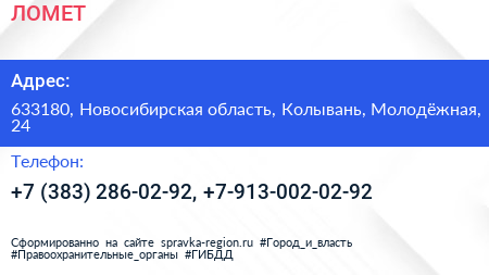 ЛОМЕТ по адресу 633180, Новосибирская область, Колывань, Молодёжная, 24 в дальнейшем Организация, размещена в следующих категориях: