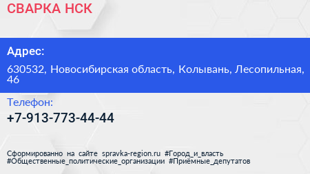 СВАРКА-НСК по адресу 630532, Новосибирская область, Колывань, Лесопильная, 46 в дальнейшем Организация, размещена в следующих категориях: