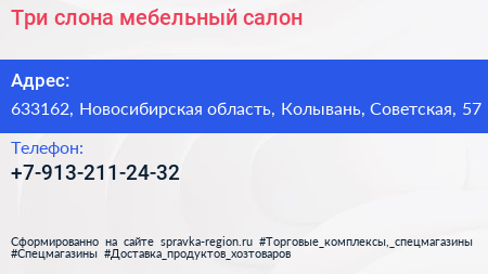 Три слона, мебельный салон по адресу 633162, Новосибирская область, Колывань, Советская, 57 в дальнейшем Организация, размещена в следующих категориях: