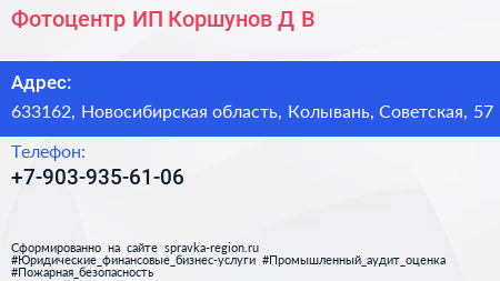 Фотоцентр, ИП Коршунов Д.В. по адресу 633162, Новосибирская область, Колывань, Советская, 57 в дальнейшем Организация, размещена в следующих категориях: