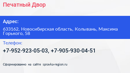 Печатный Двор по адресу 633162, Новосибирская область, Колывань, Максима Горького, 58 в дальнейшем Организация, размещена в следующих категориях: