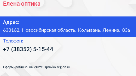 Елена, оптика по адресу 633162, Новосибирская область, Колывань, Ленина, 83а в дальнейшем Организация, размещена в следующих категориях: