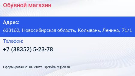 Обувной магазин по адресу 633162, Новосибирская область, Колывань, Ленина, 71/1 в дальнейшем Организация, размещена в следующих категориях:
