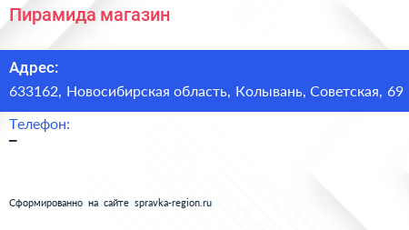 Пирамида, магазин по адресу 633162, Новосибирская область, Колывань, Советская, 69 в дальнейшем Организация, размещена в следующих категориях: