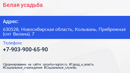 Белая усадьба по адресу 630528, Новосибирская область, Колывань, Прибрежная (снт Вилана), 7 в дальнейшем Организация, размещена в следующих категориях: