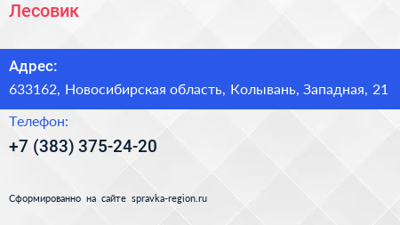 Лесовик по адресу 633162, Новосибирская область, Колывань, Западная, 21 в дальнейшем Организация, размещена в следующих категориях: