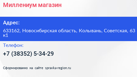 Миллениум, магазин по адресу 633162, Новосибирская область, Колывань, Советская, 63 к1 в дальнейшем Организация, размещена в следующих категориях: