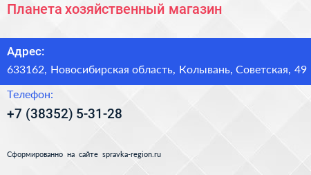 Планета, хозяйственный магазин по адресу 633162, Новосибирская область, Колывань, Советская, 49 в дальнейшем Организация, размещена в следующих категориях: