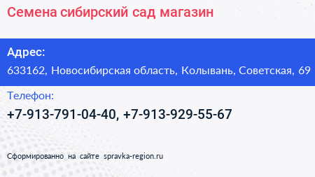 Семена сибирский сад, магазин по адресу 633162, Новосибирская область, Колывань, Советская, 69 в дальнейшем Организация, размещена в следующих категориях: