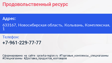 Продовольственный ресурс по адресу 633167, Новосибирская область, Колывань, Комплексная, 1 в дальнейшем Организация, размещена в следующих категориях: