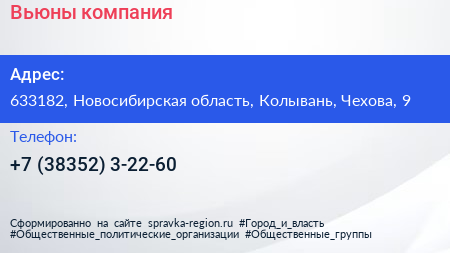 Вьюны, компания по адресу 633182, Новосибирская область, Колывань, Чехова, 9 в дальнейшем Организация, размещена в следующих категориях: