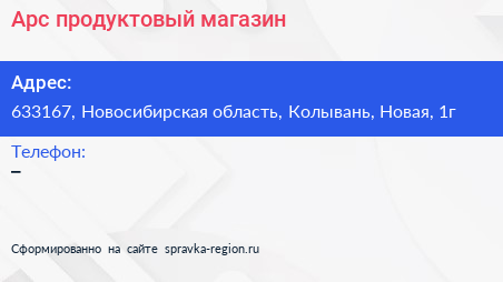 Арс, продуктовый магазин по адресу 633167, Новосибирская область, Колывань, Новая, 1г в дальнейшем Организация, размещена в следующих категориях: