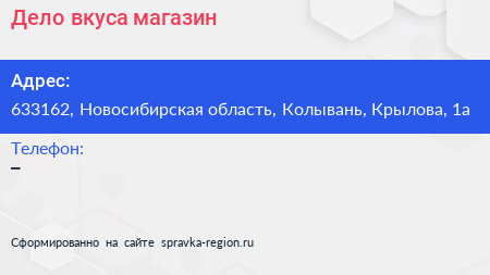 Дело вкуса, магазин по адресу 633162, Новосибирская область, Колывань, Крылова, 1а в дальнейшем Организация, размещена в следующих категориях: