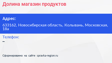 Долина, магазин продуктов по адресу 633162, Новосибирская область, Колывань, Московская, 18а в дальнейшем Организация, размещена в следующих категориях:
