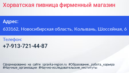 Хорватская пивница, фирменный магазин по адресу 633162, Новосибирская область, Колывань, Шоссейная, 6 в дальнейшем Организация, размещена в следующих категориях: