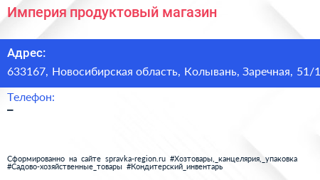 Империя, продуктовый магазин по адресу 633167, Новосибирская область, Колывань, Заречная, 51/1 в дальнейшем Организация, размещена в следующих категориях: