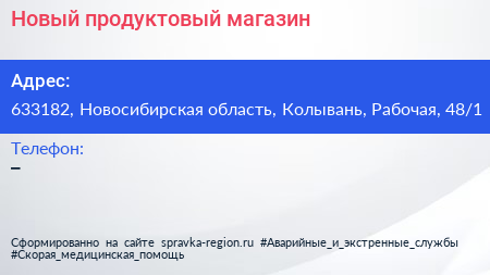 Новый, продуктовый магазин по адресу 633182, Новосибирская область, Колывань, Рабочая, 48/1 в дальнейшем Организация, размещена в следующих категориях: