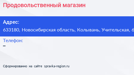 Продовольственный магазин по адресу 633180, Новосибирская область, Колывань, Учительская, 6 в дальнейшем Организация, размещена в следующих категориях: