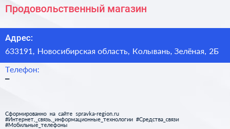 Продовольственный магазин по адресу 633191, Новосибирская область, Колывань, Зелёная, 2Б в дальнейшем Организация, размещена в следующих категориях: