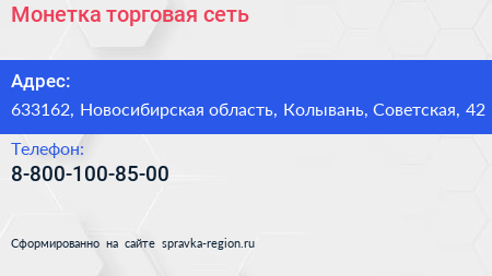 Монетка, торговая сеть по адресу 633162, Новосибирская область, Колывань, Советская, 42 в дальнейшем Организация, размещена в следующих категориях: