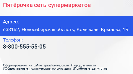Пятёрочка, сеть супермаркетов по адресу 633162, Новосибирская область, Колывань, Крылова, 1Б в дальнейшем Организация, размещена в следующих категориях: