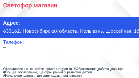 Светофор, магазин по адресу 633162, Новосибирская область, Колывань, Шоссейная, 16 в дальнейшем Организация, размещена в следующих категориях: