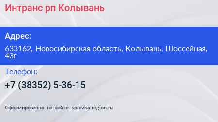 Интранс, рп. Колывань по адресу 633162, Новосибирская область, Колывань, Шоссейная, 43г в дальнейшем Организация, размещена в следующих категориях: