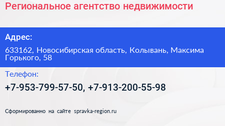 Региональное агентство недвижимости по адресу 633162, Новосибирская область, Колывань, Максима Горького, 58 в дальнейшем Организация, размещена в следующих категориях: