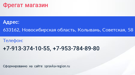 Фрегат, магазин по адресу 633162, Новосибирская область, Колывань, Советская, 58 в дальнейшем Организация, размещена в следующих категориях:
