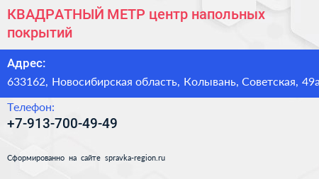 КВАДРАТНЫЙ МЕТР, центр напольных покрытий по адресу 633162, Новосибирская область, Колывань, Советская, 49а в дальнейшем Организация, размещена в следующих категориях:
