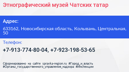 Этнографический музей Чатских татар по адресу 633162, Новосибирская область, Колывань, Центральная, 50 в дальнейшем Организация, размещена в следующих категориях: