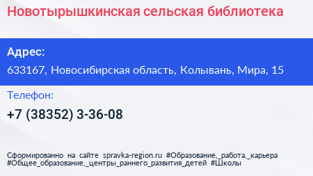 Новотырышкинская сельская библиотека по адресу 633167, Новосибирская область, Колывань, Мира, 15 в дальнейшем Организация, размещена в следующих категориях: