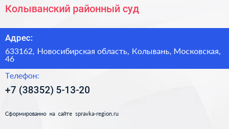 Колыванский районный суд по адресу 633162, Новосибирская область, Колывань, Московская, 46 в дальнейшем Организация, размещена в следующих категориях: