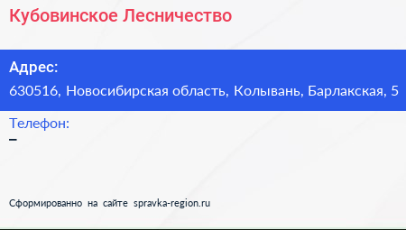 Кубовинское Лесничество по адресу 630516, Новосибирская область, Колывань, Барлакская, 5 в дальнейшем Организация, размещена в следующих категориях: