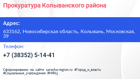 Прокуратура Колыванского района по адресу 633162, Новосибирская область, Колывань, Московская, 39 в дальнейшем Организация, размещена в следующих категориях: