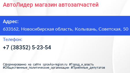 АвтоЛидер, магазин автозапчастей по адресу 633162, Новосибирская область, Колывань, Советская, 50 в дальнейшем Организация, размещена в следующих категориях: