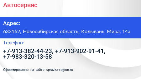 Автосервис по адресу 633162, Новосибирская область, Колывань, Мира, 14а в дальнейшем Организация, размещена в следующих категориях:
