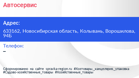 Автосервис по адресу 633162, Новосибирская область, Колывань, Ворошилова, 94Б в дальнейшем Организация, размещена в следующих категориях: