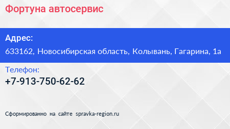 Фортуна, автосервис по адресу 633162, Новосибирская область, Колывань, Гагарина, 1а в дальнейшем Организация, размещена в следующих категориях: