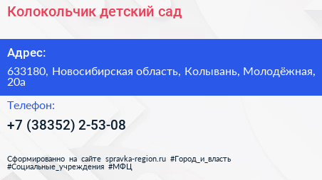 Колокольчик, детский сад по адресу 633180, Новосибирская область, Колывань, Молодёжная, 20а в дальнейшем Организация, размещена в следующих категориях: