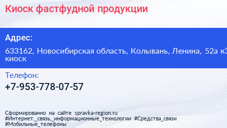 Киоск фастфудной продукции по адресу 633162, Новосибирская область, Колывань, Ленина, 52а к3 киоск в дальнейшем Организация, размещена в следующих категориях: