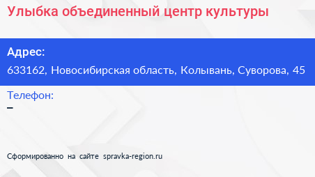 Улыбка, объединенный центр культуры по адресу 633162, Новосибирская область, Колывань, Суворова, 45 в дальнейшем Организация, размещена в следующих категориях: