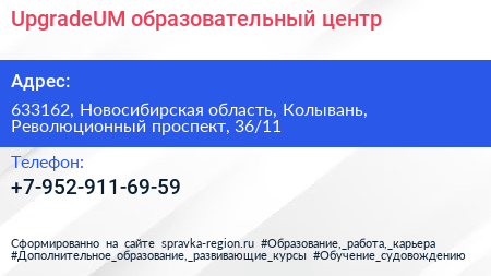 UpgradeUM, образовательный центр по адресу 633162, Новосибирская область, Колывань, Революционный проспект, 36/11 в дальнейшем Организация, размещена в следующих категориях: