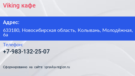 Viking, кафе по адресу 633180, Новосибирская область, Колывань, Молодёжная, 6а в дальнейшем Организация, размещена в следующих категориях: