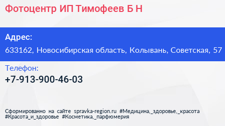 Фотоцентр, ИП Тимофеев Б.Н. по адресу 633162, Новосибирская область, Колывань, Советская, 57 в дальнейшем Организация, размещена в следующих категориях: