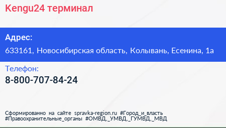 Kengu24, терминал по адресу 633161, Новосибирская область, Колывань, Есенина, 1а в дальнейшем Организация, размещена в следующих категориях: