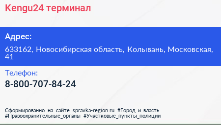 Kengu24, терминал по адресу 633162, Новосибирская область, Колывань, Московская, 41 в дальнейшем Организация, размещена в следующих категориях: