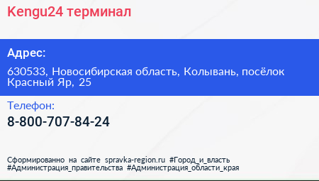 Kengu24, терминал по адресу 630533, Новосибирская область, Колывань, посёлок Красный Яр, 25 в дальнейшем Организация, размещена в следующих категориях:
