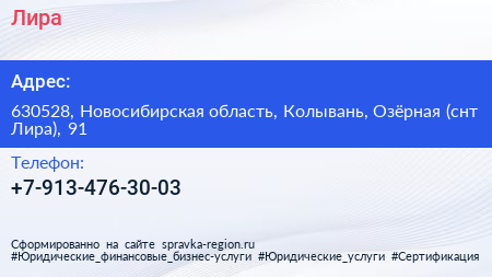 Лира по адресу 630528, Новосибирская область, Колывань, Озёрная (снт Лира), 91 в дальнейшем Организация, размещена в следующих категориях: