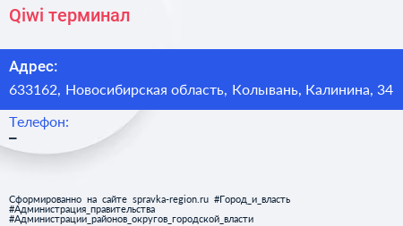 Qiwi, терминал по адресу 633162, Новосибирская область, Колывань, Калинина, 34 в дальнейшем Организация, размещена в следующих категориях: